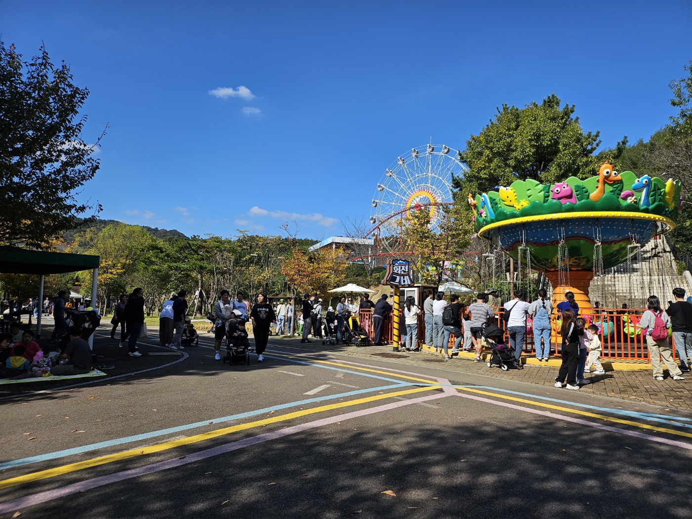 유모차를 가지고 온 사람들이 상당했어요. 저희 아기가 16개월인것처럼 비슷한 또래들부터 더 큰 아이들도 많았는데 김해가야랜드 자체가 초등학교 저학년까지만 재밌게 놀고오기 좋은 것 같고 그 이후는 시시해할 것 같아요. 입구 쪽에는 회전목마, 회전그네, 아기가 수동으로 노를 저을 수 있는 보트, 자동차 등의 놀이기구가 있었고요.