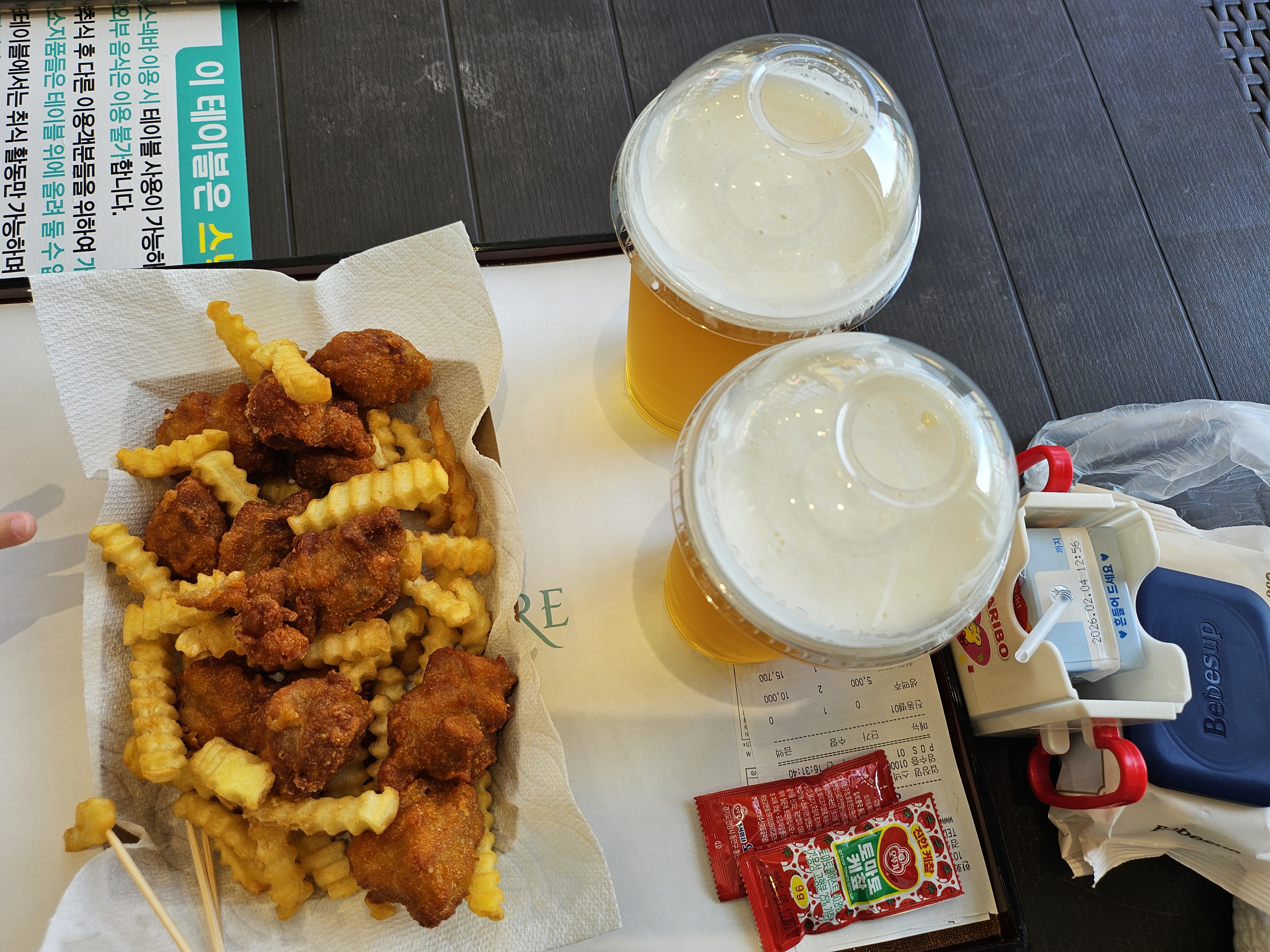 먹거리도 있어서 물놀이하다가 중간에 맥주랑 치킨 사먹었어요. 아기는 룸에서 준비해간 아기 쥬스 먹게했고 그물가방에 물티슈, 아기쥬스 등 넣어갔는데 물품 놔두는 곳도 있어 편하고 좋았네요.