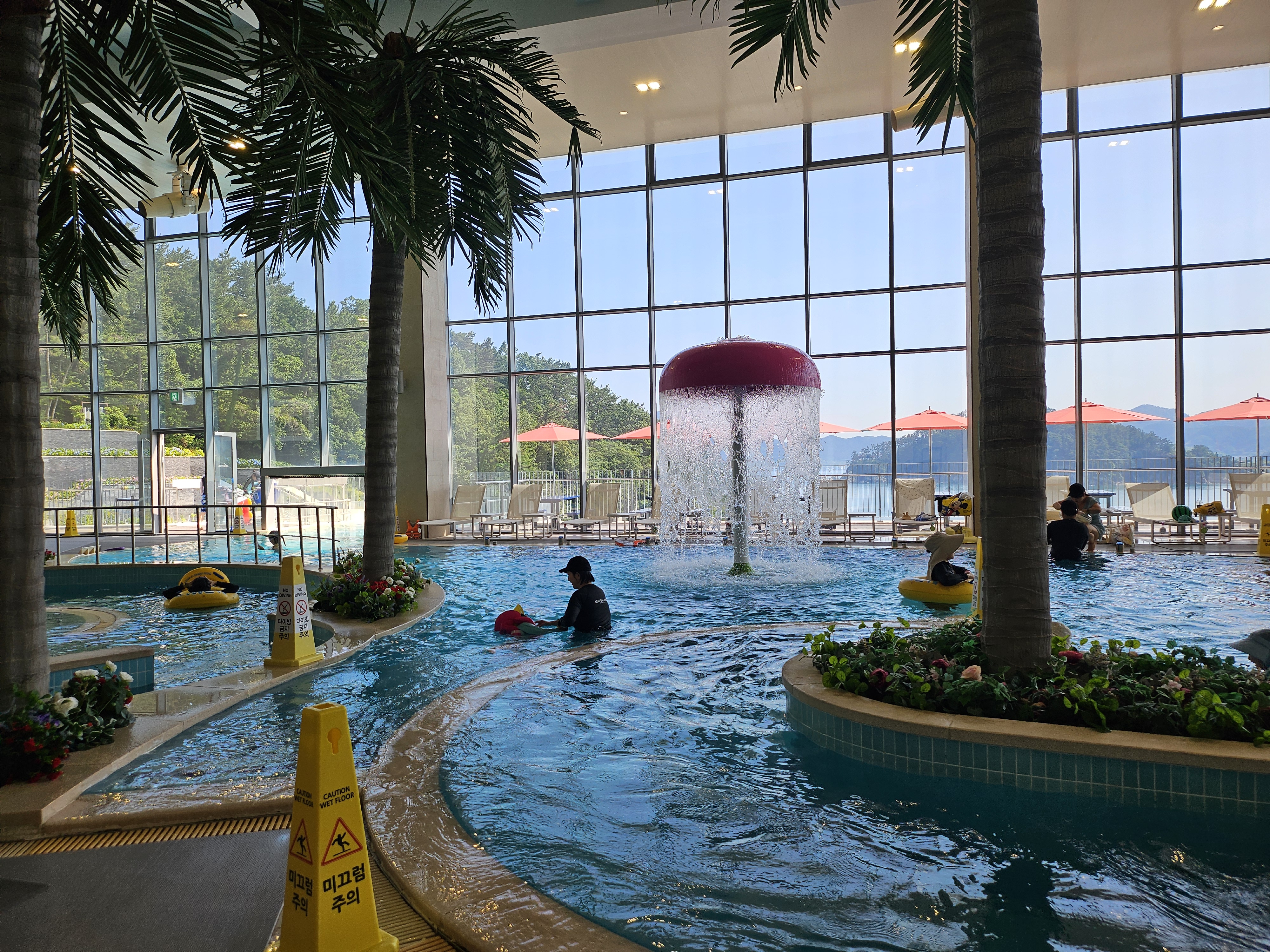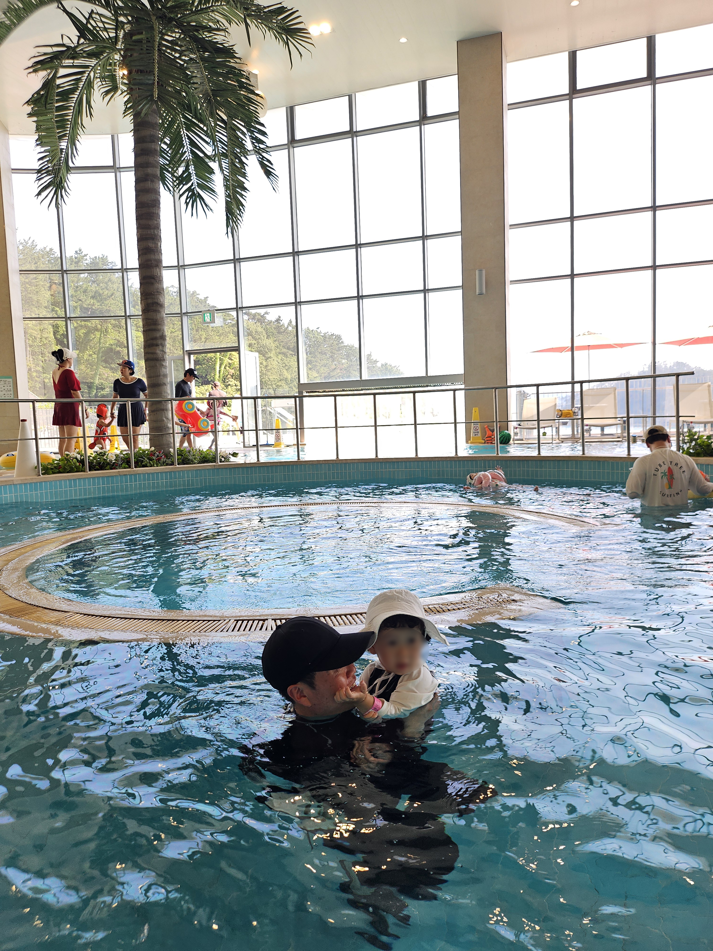 실내 수영장도 아기랑 놀기에 너무 잘 되어 있었고 아기 구명조끼, 튜브 다 준비되어 있어요. 24개월 아기에게 아기 구명조끼는 조금 큰 편이긴 했으나 그래도 괜찮았어요.