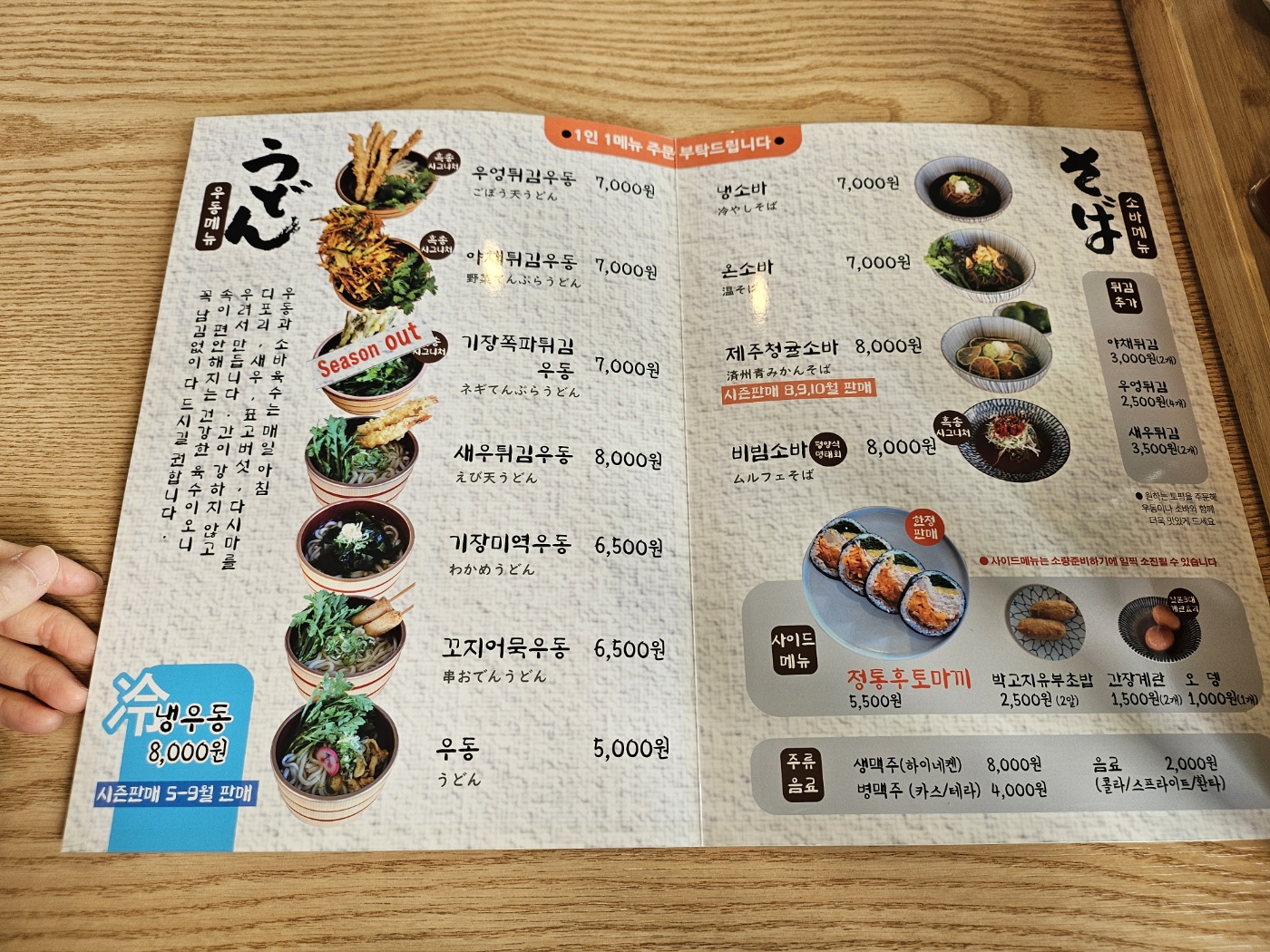 우엉튀김, 야채튀김, 기장쪽파, 새우튀김, 기장미역 등의 여러 우동이 있고 소바도 4가지에 여러 사이드 메뉴가 있어요. 가격은 5~8천원대로 괜찮은 편이었어요.